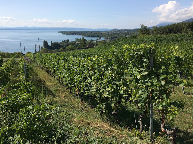 .... en ineens vanaf Neuchatel zit ik tussen de wijngaarden die helemaal langs de heuvels langs het meer verbouwd worden...